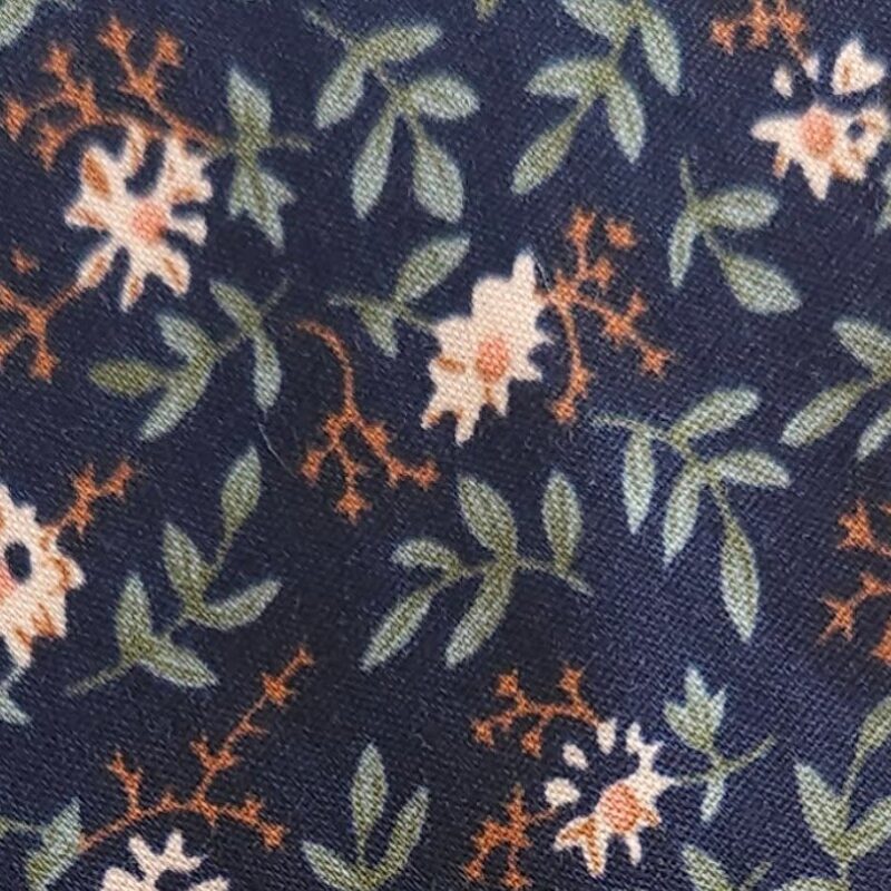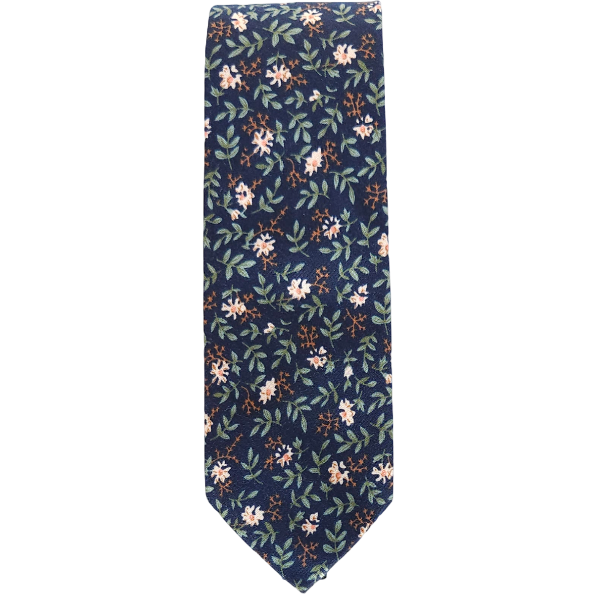 This tie has a navy background featuring a medley of flowers in pale peach with leaf stems throughout.